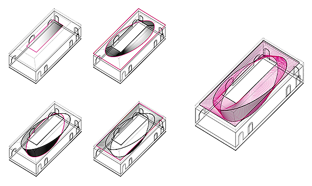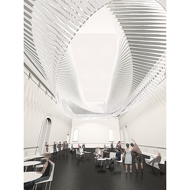 Inside the Grand Salon, two elliptical voids would form a new ceiling while framing a light emitting surface. Lightweight ceramic panels would frame the voids, and each void rotates the panels on their edges to allow for screened views of the historic structure beyond. The panels would be geometrically torqued, accentuating Ellipsis’ dynamic form. The digitally-produced, hollow ceramic panels would be fabricated by combining computer numeric controlled milling with traditional ceramic slip-forming techniques.