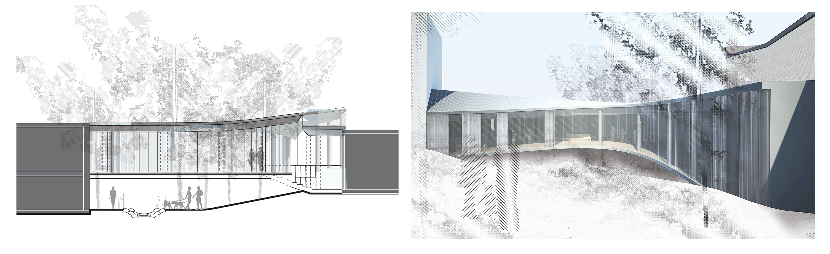 The skies over central Finland are a year-round kaleidoscope of color gradients, from the daylong bright blue of the summer days to the grey-blue sky of the Northern Lights visible, at times, in the area. These gradient colors occur as a result of unique atmospheric conditions in the extremes between the winter and summer months: blue to orange during sunrise and grey-blue to green to magenta during the Northern Lights. The Skylit proposal for an extension between the Alvar Aalto Museum and the Museum of Central Finland is calibrated to permit these changing light gradients into the museum, transforming its interior atmospheres throughout the year.