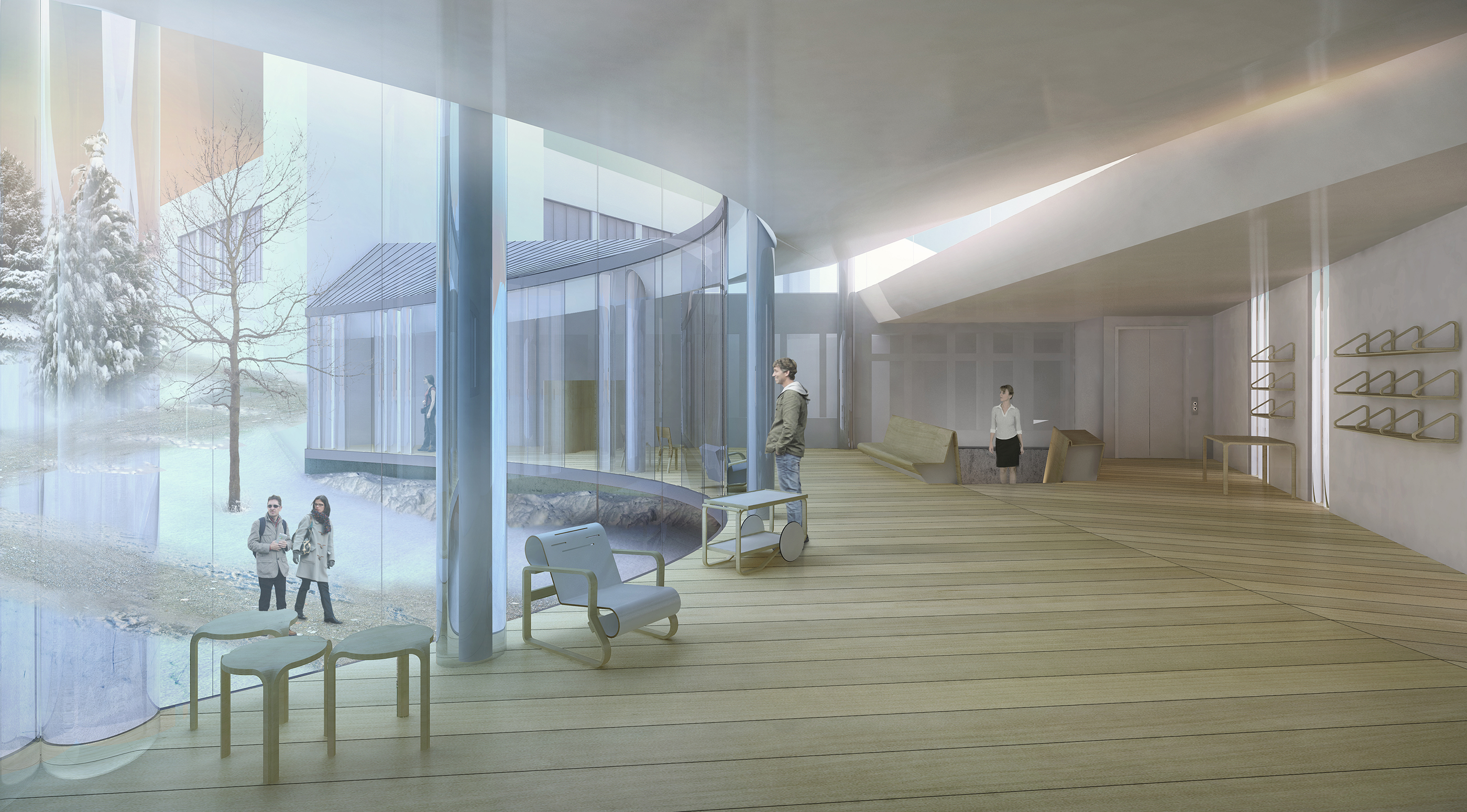 Skylit learns from the numerous skylights that Aalto developed over his career—but rather than copy any one in particular, the entire extension is conceived of as a single large skylight. A single cut in the roof faces east, matching the morning angle of light in the Alvar Aalto museum, but with a triangular—instead of rectangular—surface of glass. This skylight allows light to cast upon the slightly curved reflective ceiling. The ceiling surface receives two color gradients of light—eastern light from the skylight, southern and western light from the curved glass wall. These shifting color gradients of light create subtle changes in the interior atmosphere of the museum extension, giving expression to the name “Skylit.”